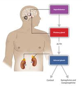 In questa figura è sintetizzata la cascata di avvenimenti che portano, partendo dal cervello, all’attivazione delle ghiandole surrenali con successiva produzione di adrenalina, noradrenalina, cortisolo e aldosterone. Queste sostanze determinano, ognuna per la sua parte, la “preparazione” dell’organismo ad una risposta combattimento/fuga. In effetti esiste anche una terza modalità di risposta il frezeeng di cui parleremo più avanti.